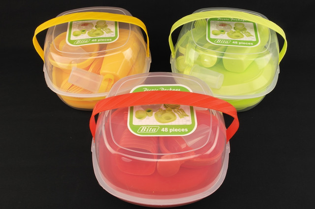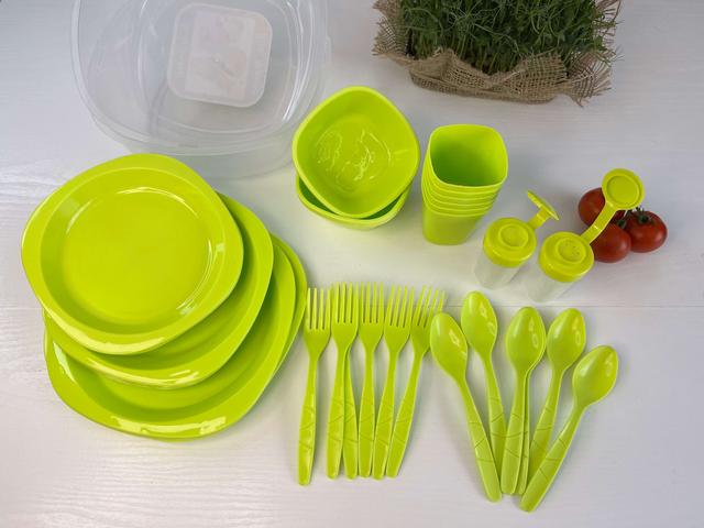 Набір посуду з 46 предметів для пікніка виготовлений з харчового пластику. Такий набір посуду знадобиться в поході, на пікніку, вечірці або дитячому святі. Посуд відрізняється високою якістю і стильним зовнішнім виглядом. Використовувати посуд з набору не тільки дуже зручно, але й безпечно, адже вона не б'ється.
