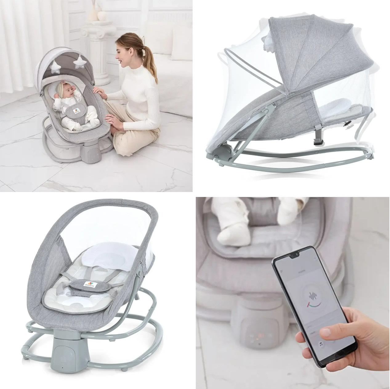 Спинка регулюється ременем таймер 15, 30, 45 за замовчуванням 60 5 швидкостей хитання 15 мелодій, регулювання гучності MP3+USB+Bluetooth панель управління APP додаток (Android, iOS) 5-ти точкові ремені безпеки кут нахилу 132 ° - 158 ° робиться шезлонгом стопори гойдання шезлонгу складана